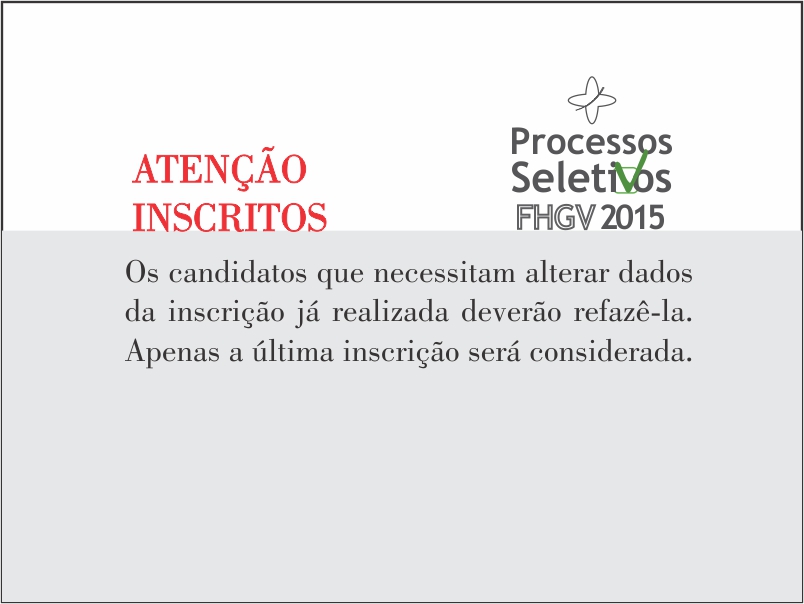 Considerando que alguns candidatos aos processos seletivos da FHGV nos municípios de Sapucaia do Sul e Charqueadas necessitam alterar dados fornecidos para inscrição, comunicamos o que segue: