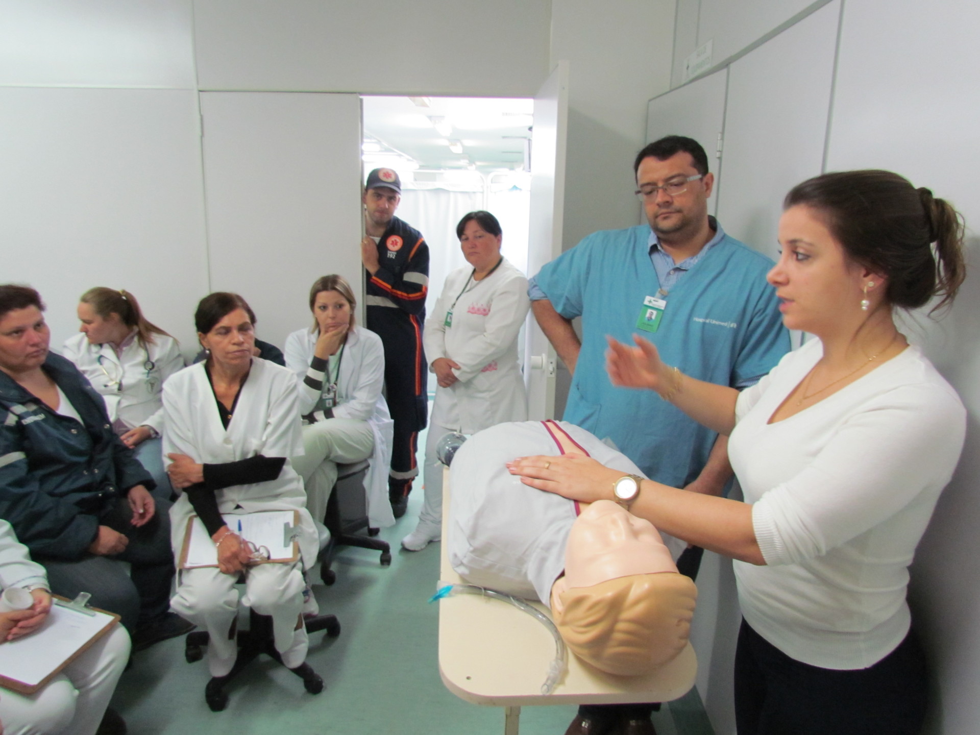 O tema “Reanimação Cardiopulmonar (RCP) Neo e Pediátrico” atraiu grande quantidade de profissionais da enfermagem, que lotaram a sala de treinamentos do Hospital Municipal Getúlio Vargas, na manhã desta quinta-feira (7/5). A capacitação foi conduzida pelo médico coordenador da Emergência do HMGV e responsável técnico do Samu, Juliano Lima, e a enfermeira coordenadora da Linha de Cuidado Mãe, Bebê e Criança do hospital, Letícia Santomé. Eles explicaram os protocolos de RCP em recém nascidos e crianças, transmitindo informações atualizadas na teoria e na prática. A enfermeira Letícia Santomé destacou que o trabalho em equipe é fundamental no atendimento a uma parada respiratória. “Precisamos ter a consciência de que ninguém faz nada sozinho no momento de urgência e emergência. Quando fazemos nossa parte, ficamos mais tranqüilos”, salientou.