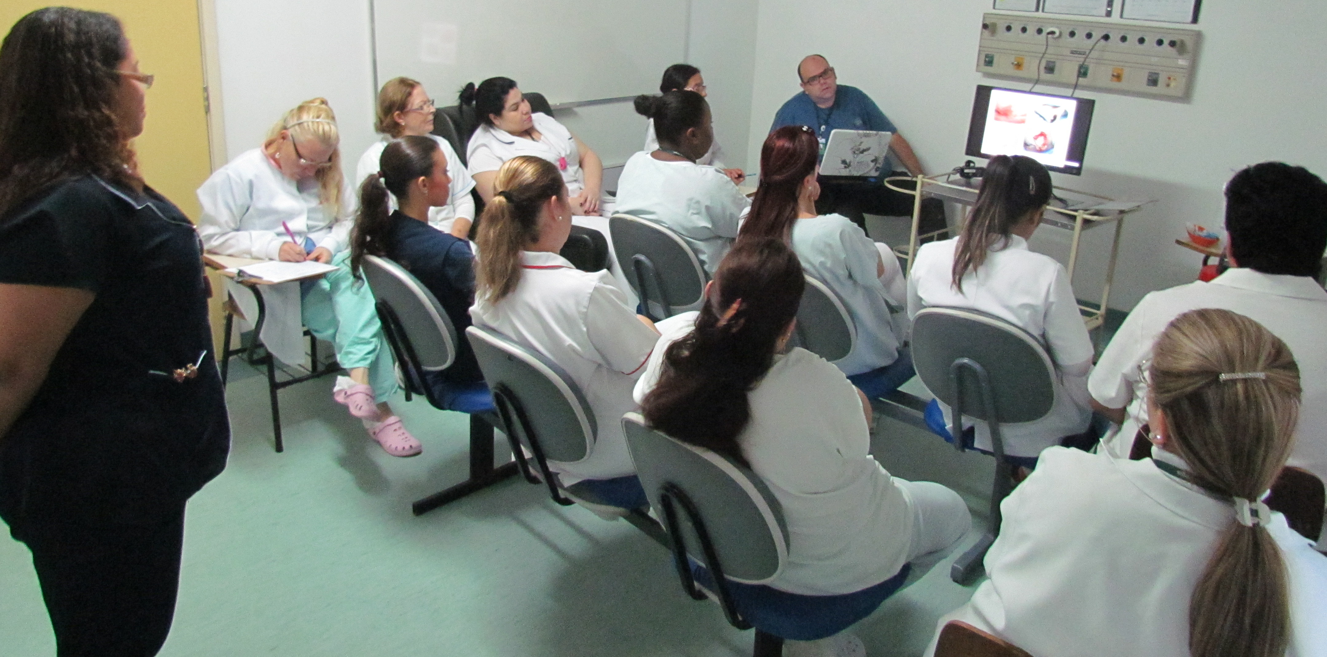 No dia 9 de junho, profissionais de enfermagem acompanharam mais um treinamento do Programa de Educação Permanente do Hospital Municipal Getúlio Vargas (HMGV), na sala de capacitação. A enfermeira intensivista Patrícia Fanton e o enfermeiro Gilnei Veloso, ambos do HMGV, abordaram o tratamento de feridas, orientando os devidos procedimentos e cuidados para fazer os curativos. “Trata-se de uma oportunidade para os trabalhadores reciclarem seus conhecimentos, tirando dúvidas. Nas capacitações, fortalecemos a ideia de trabalho em equipe, incentivando que os profissionais tenham sintonia no grupo e mais empatia com o paciente. Também esclarecemos pontos da legislação de enfermagem, a fim de respaldar o trabalho dos técnicos e enfermeiros”, explica Patrícia Fanton.