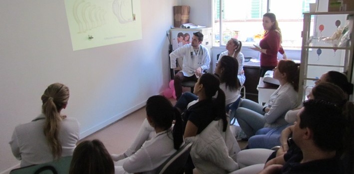 Enfermeiros, técnicos de enfermagem, fisioterapeutas e estagiários lotaram a sala de capacitação do Hospital Municipal Getúlio Vargas (HMGV) para atualizar conhecimentos sobre atendimento inicial ao trauma, na manhã desta quarta-feira (14/10). O tema foi conduzido pela chefe da emergência do HMGV, Letícia Santomé, que transmitiu orientações para prestar socorro às vítimas de politraumatismo na Sala Vermelha. “Nosso objetivo é capacitar os profissionais da emergência adulto e pediátrico, assim como os demais trabalhadores da saúde interessados no assunto. Até o momento já beneficiamos 40% dos profissionais”, salientou Letícia Santomé.