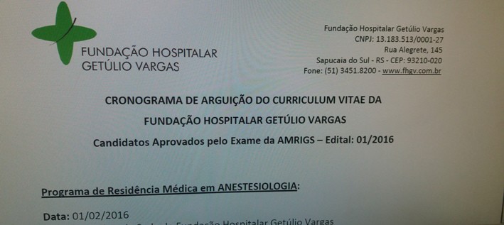 Desde o último dia 4, está disponível no site da Fundação Hospitalar Getúlio Vargas (FHGV) o cronograma de arguição do Curriculum Vitae dos candidatos aprovados pelo exame da AMRIGS, referente ao edital 01/2016. Confira o cronograma: