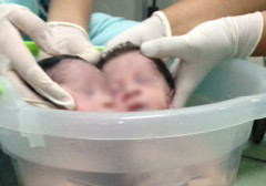 Hospital Tramandaí realiza o primeiro banho de balde em bebês gêmeos no Centro Obstétrico