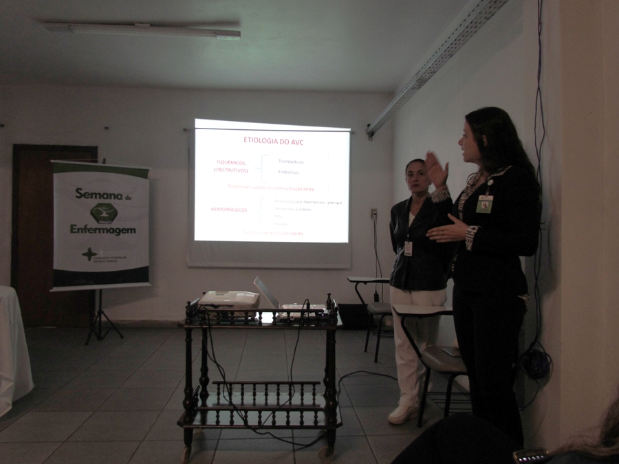A primeira palestra, ministrada pelas enfermeiras Letícia Santomé e Flávia Motta, abordou o tema “Protocolo de AVC”.  O Acidente Vascular Cerebral é a segunda maior causa de óbito no planeta, ficando atrás apenas das doenças vasculares. Trata-se de uma interrupção no fluxo sanguíneo do cérebro, que pode ocorrer de forma insquêmica (80%dos casos) ou hemorrágica (20%). As palestrantes trataram de várias fases, sintomas, diagnósticos e condutas em cada caso ou situação.