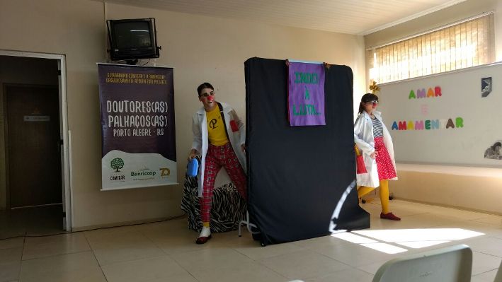 Os integrantes do projeto “Doutores Palhaços – Alegria que Transforma” foram atração durante o sábado, dia 13 de agosto, no Hospital Tramandaí. Pela manhã, através de brincadeiras e jogos, Dra. BailaNina, Dra. Clotilde e Dr. P. Nico envolveram usuários, acompanhantes e trabalhadores do Hospital, num clima de descontração que animou o ambiente. A visita dos artistas foi acompanhada por representantes da Comissão de Humanização do Hospital Tramandaí. Na parte da tarde, o grupo apresentou o esquete teatral “Melhor que isso, só dois disso”. No dia 10 de setembro, haverá nova apresentação do projeto no HT.