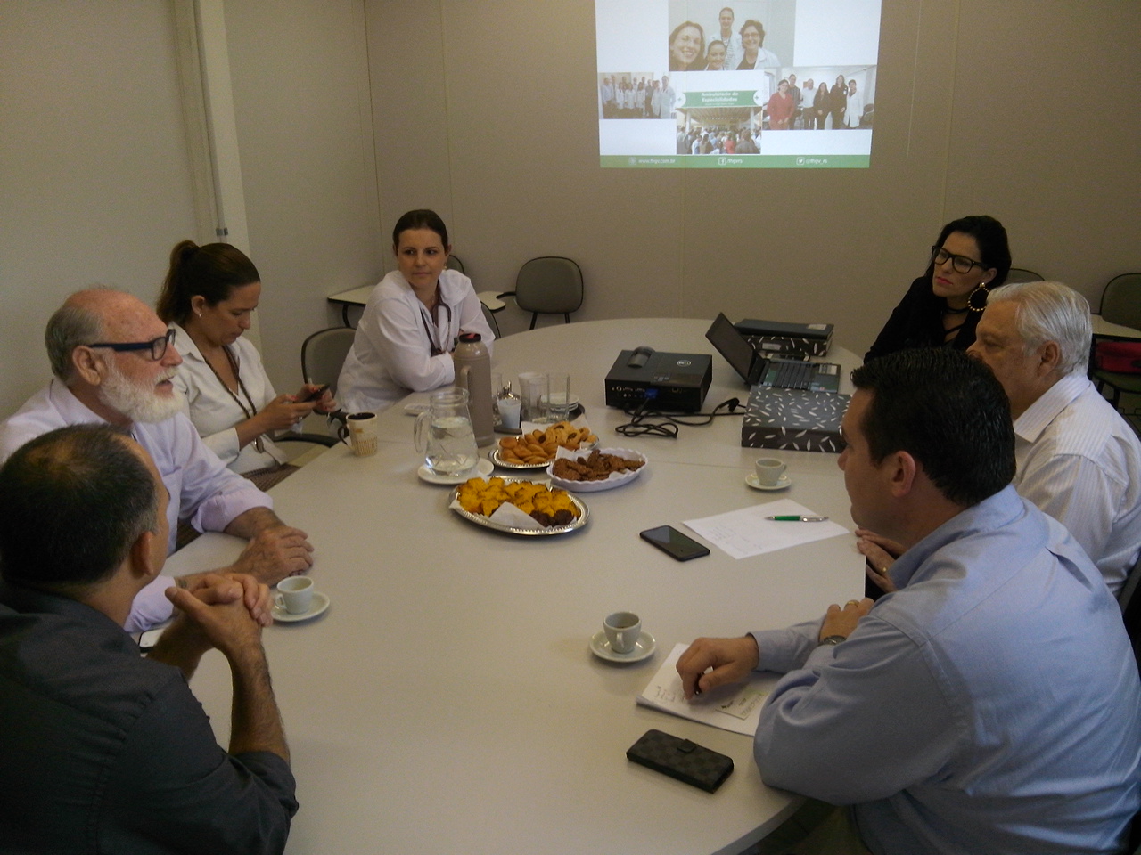 Os avaliadores chegaram na sede da FHGV pontualmente às 8 horas. Na sala de reuniões, foram recebidos pelo diretor geral da Fundação, Juarez Verba; pela coordenadora da URPE, Carolina Santanna; pelos diretores do Hospital, Leandro Barcellos (administrativo) e Loredi Becker (assistencial); e pelos supervisores dos programas de residência médica. De imediato os visitantes puderam assistir a apresentação da preceptora e supervisora do PR em Clínica Médica, Adriana Anzveiler, que mostrou detalhes sobre os objetivos, o histórico, a rotina semanal e outros itens que compõem o referido Programa.