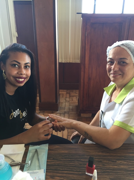 As trabalhadoras do Hospital Regional do Vale do Rio Pardo (HRVRP) foram recepcionadas com uma série de atividades no dia 8 de março, incluindo coquetel, maquiagem e embelezamento de unhas e cabelo. O evento contou com o apoio de lojas especializadas e salões de beleza. Também acompanharam a atividade, a assessora especial da Fundação Hospitalar Getúlio Vargas (FHGV), Juliane Dias, o diretor administrativo do HRVRP, Márcio Borges, e a responsável pela Unidade de Saúde Mental do HRVRP, Alba Zacharias.