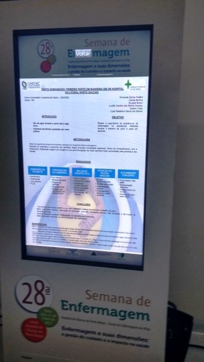 Um banner com a experiência do 1º parto na banheira realizado no Centro Obstétrico do Hospital Tramandaí foi apresentado durante a Semana de Enfermagem do Hospital de Clínicas de Porto Alegre, no dia 10 de maio. O relato foi feito pela acadêmica de enfermagem e trabalhadora do C.O., Fernanda Padilha, com o apoio da coordenadora da Unidade, a enfermeira Quelen da Costa, e da supervisora de estágio, a enfermeira Luzia Vianna. Conforme a enfermeira Quelen, “o trabalho do HT foi extremamente elogiado e parabenizado pelos profissionais do Hospital de Clinicas”.