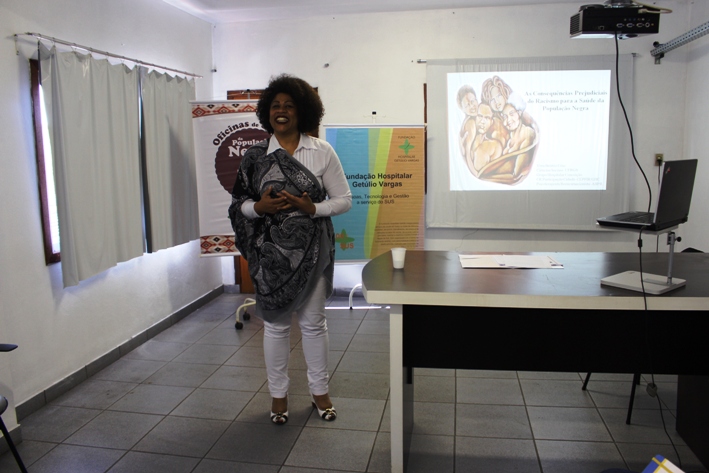 Falar sobre um tema pesado, como o racismo institucional, de uma forma leve e doce. Foi assim que a ativista Vera Beatriz Soares da Cruz conduziu o Bate-papo sobre Igualdade Racial, na tarde de quinta-feira (31), no auditório da Fundação Hospitalar Getúlio Vargas. Ela é assistente de coordenação do Centro de Resultados de Participação Cidadã do Grupo Hospitalar Conceição e membro da Comissão Especial de Políticas de Promoção da Igualdade Racial do GHC.