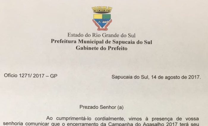 A coordenadora da UPA Sapucaia do Sul, Carla Micheline Queiroz, recebeu um ofício assinado pelo prefeito do município, Dr. Luis Rogério Link, agradecendo a participação da Unidade na Campanha do Agasalho deste ano, encerrada nesta segunda-feira, que superou a meta e ultrapassou o número de peças de roupas e alimentos angariados de 2016. No documento, Dr. Link enaltece o trabalho e a dedicação da equipe
