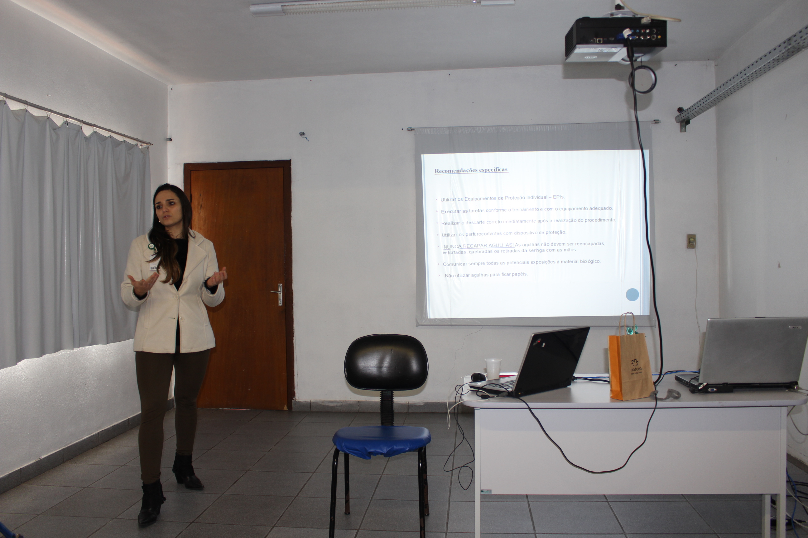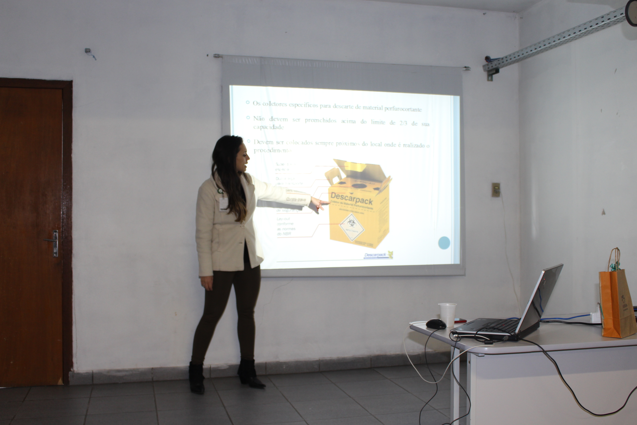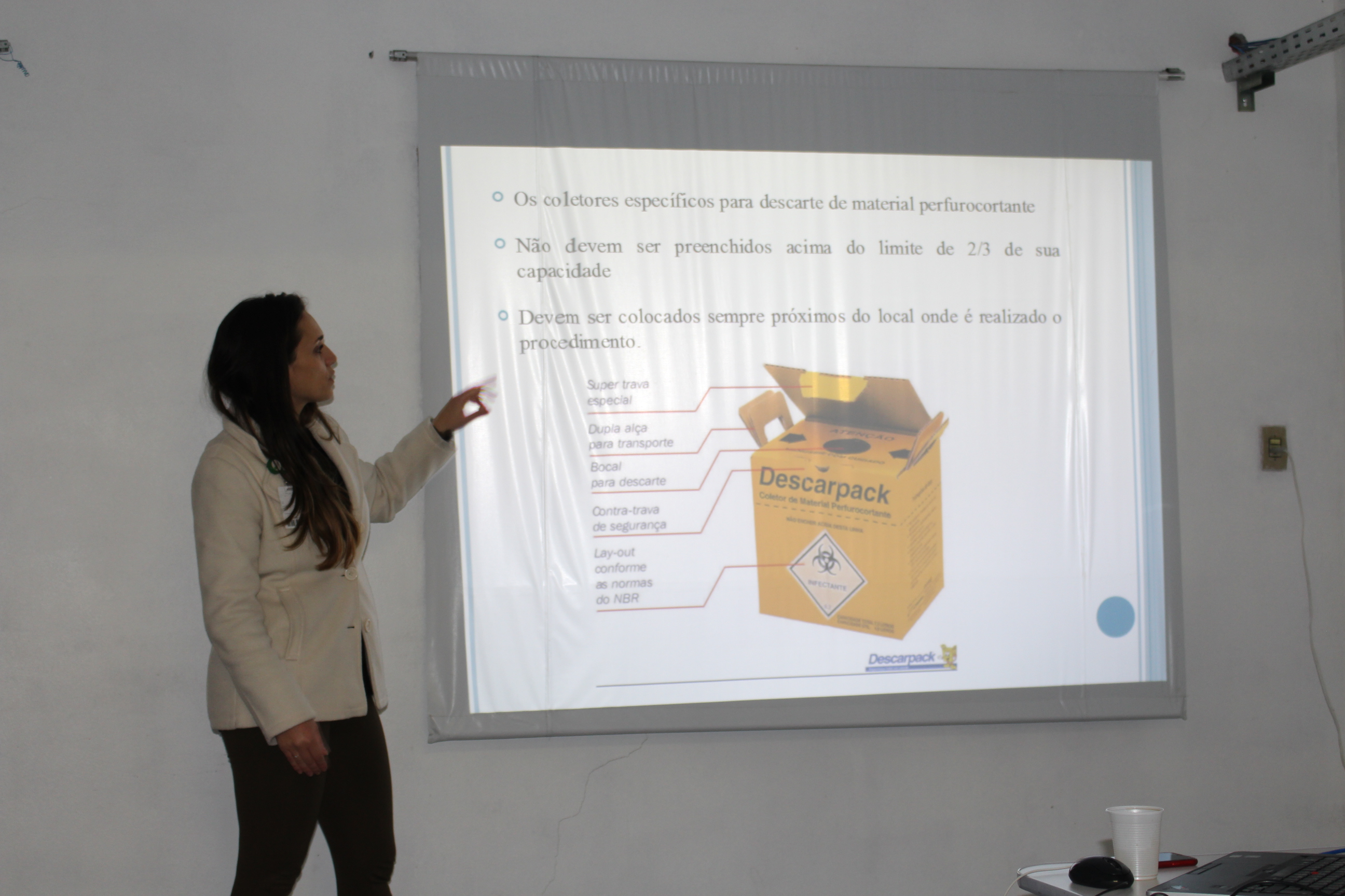 Na tarde desta terça-feira (31), a Comissão Interna de Prevenção de Acidentes (CIPA) da FHGV realizou uma palestra sobre Acidentes de Trabalho com Materiais Biológicos. Na ocasião, a médica da saúde do trabalho Luciana Rott Monaiar falou sobre as formas de acidente, como pequenos erros podem trazer grandes consequências. “Um exemplo é reencapar as agulhas. Isso é muito frequente, mas a chance de se picar é grande. A capinha pode furar, rasgar, picando a pessoa que está usando a agulha. Depois de usar, coloque diretamente na caixa coletora de material perfurocortante!”. Luciana também tratou de como diminuir as formas de contágio de doenças como HIV, Hepatite B e C e dos procedimentos pós exposição.