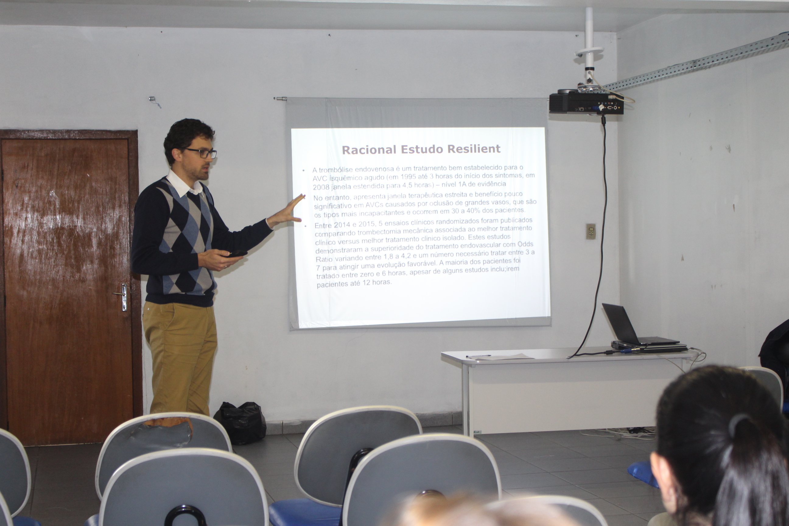 Na tarde desta quarta-feira (11), médicos, enfermeiros e técnicos do Hospital Getúlio Vargas participaram de uma capacitação realizada pelo médico neurologista Leonardo Carbonera, do Hospital de Clínicas. A atividade ocorreu no auditório da sede administrativa da FHGV. Na ocasião, os participantes receberam instruções de como identificar pacientes que possam participar do estudo Resilient, que pretende mostrar que o tratamento com trombectomia mecânica (remoção de um coágulo sob orientação de imagem) pode reduzir ainda mais as sequelas do AVC.