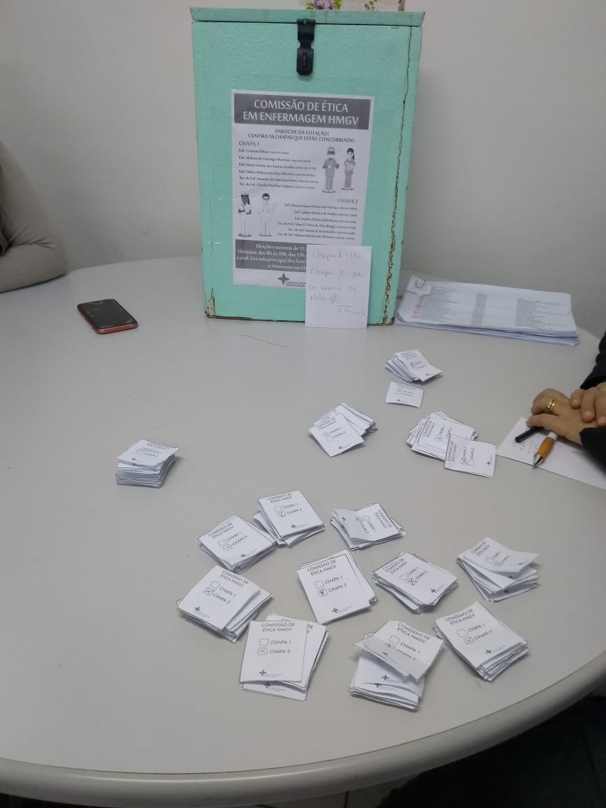 Na última quinta-feira (16), a eleição da 1ª Comissão de Ética em Enfermagem da FHGV teve sua contagem de votos. Durante a apuração estiveram presentes membros da comissão organizadora e representantes das duas chapas concorrentes. No total, a eleição contabilizou 274 votos válidos, sendo 176 votos para a chapa 1 e 97 votos para a chapa 2. Conforme edital, as chapas têm até 2 dias para recorrer do resultado a partir da data de divulgação. A posse ainda não tem data definida. Confira abaixo os membros da chapa vencedora.