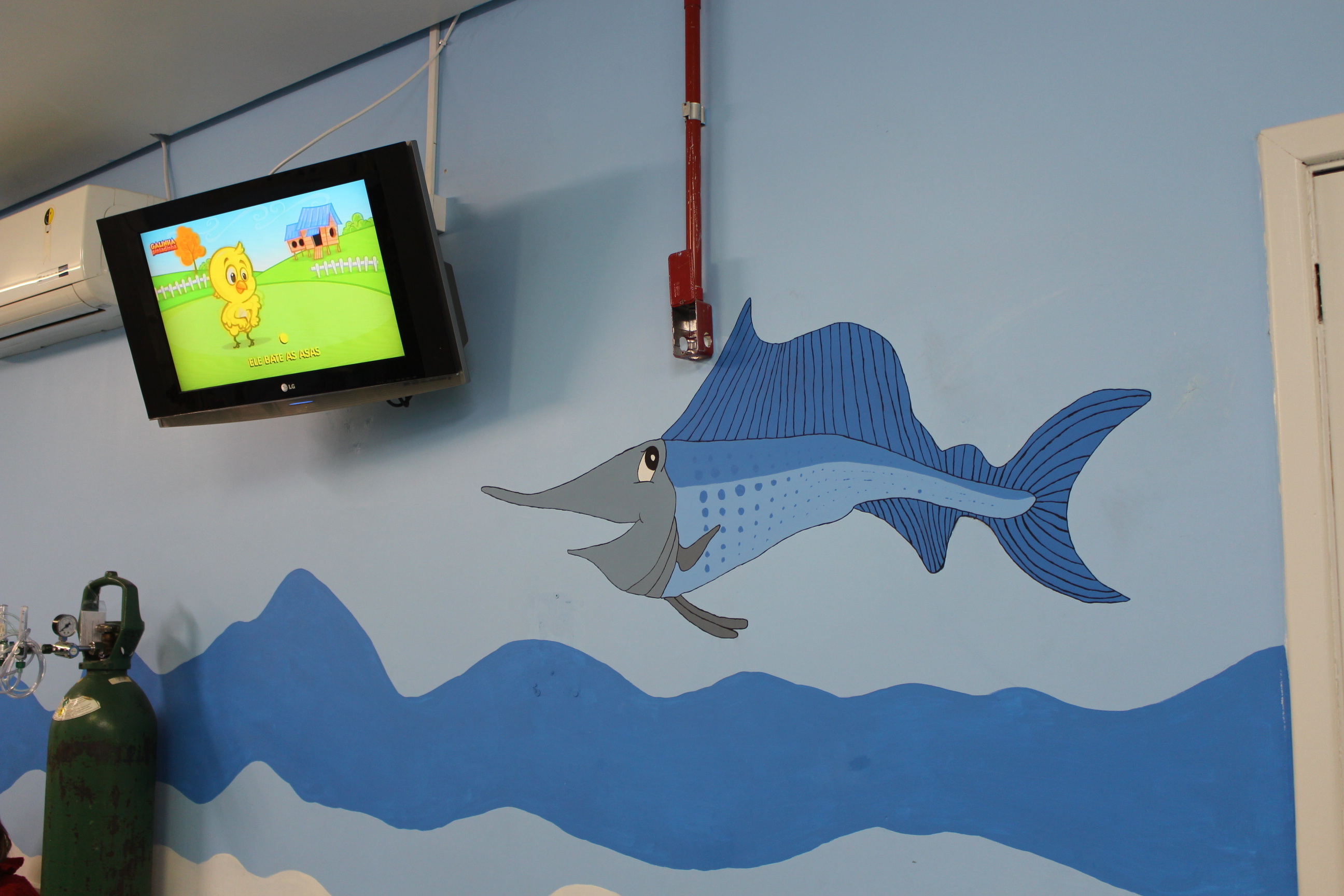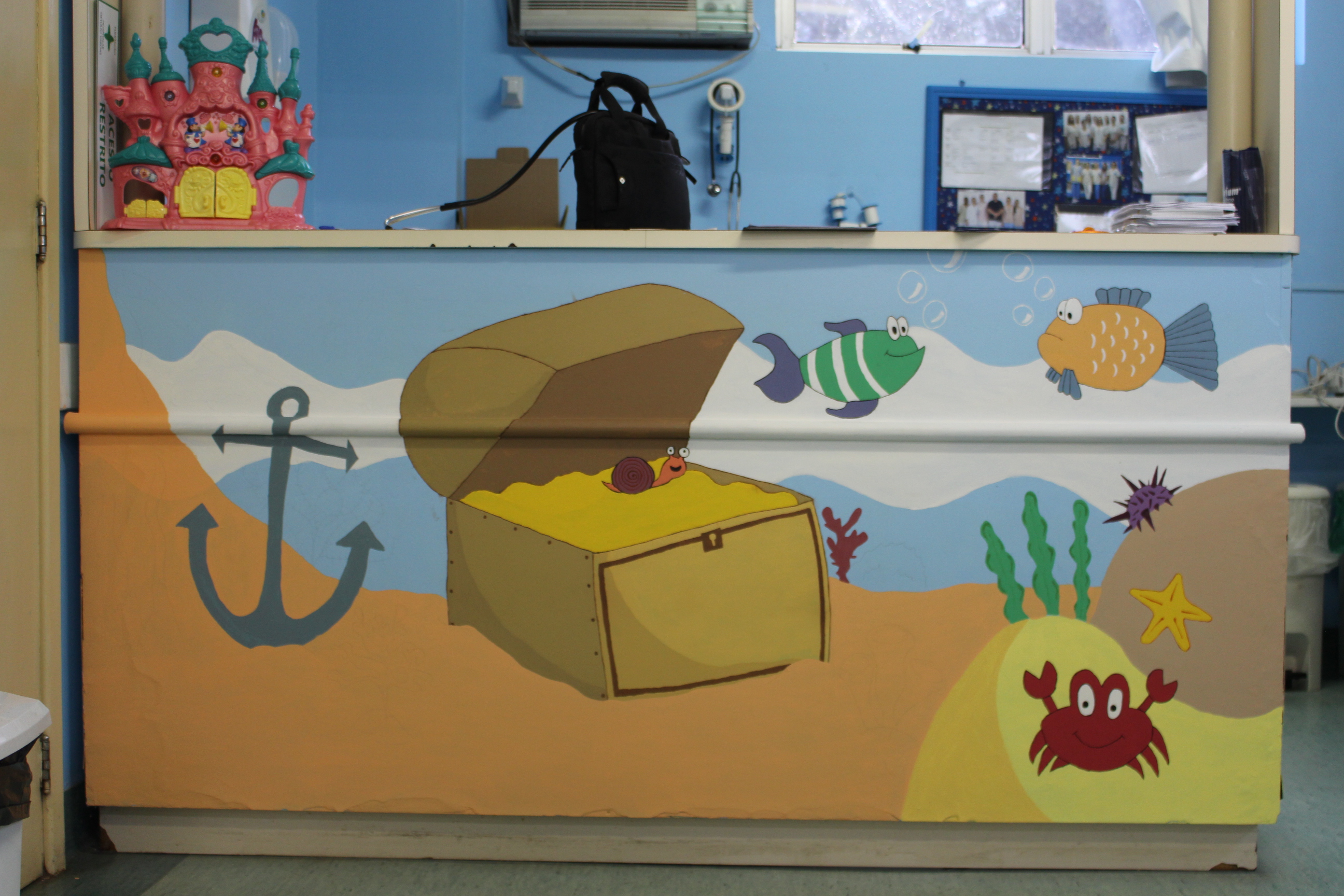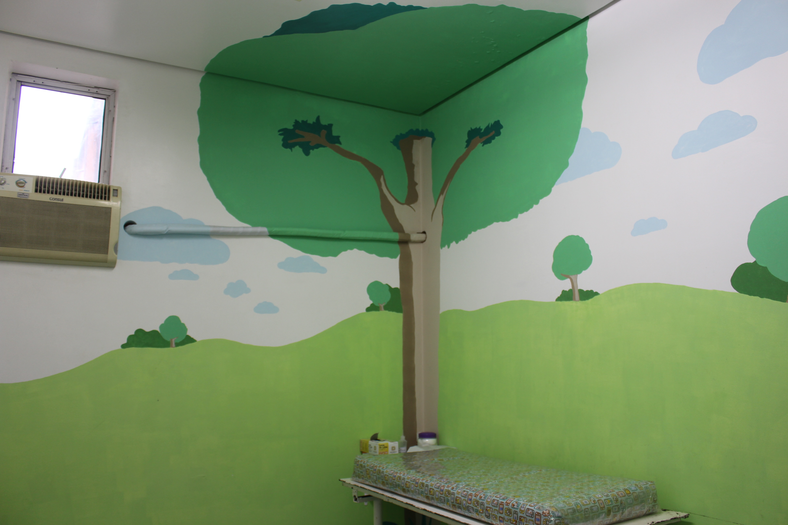 Nos últimos dois meses, o setor de pediatria do HMGV vem recebendo novas cores. Sempre que possível, Rodrigo José Hoff, marido de uma das funcionárias, solidariamente pinta as paredes da ala, trazendo mais vida aos olhos das crianças. Segundo Sabrina Santos da Silva, enfermeira, o tema escolhido para colorir a sala de observação e o consultório pediátrico foi o fundo do mar, basicamente para reaproveitar a tinta azul que já estava nas paredes. “A aquisição das tintas vem sendo gradual. O Hospital doou as tintas brancas. As coloridas nós estamos fazendo vaquinha para conseguirmos”.