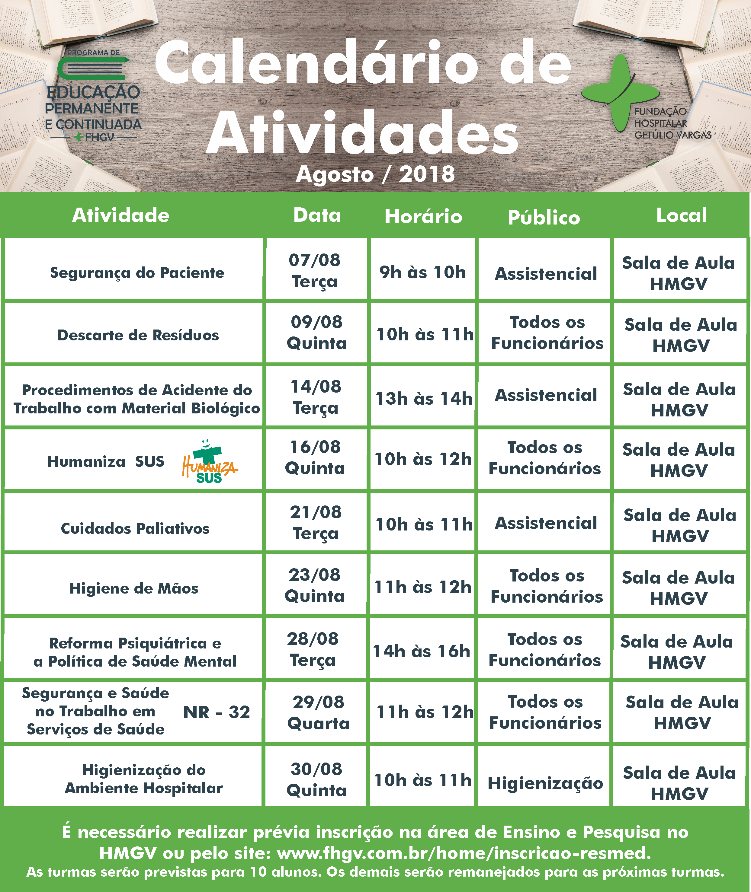 Com a chegada do mês de agosto, chegam também as novas turmas dos cursos propostos pelo Programa de Educação Permanente e Continuada da FHGV. As aulas começam no dia 7 de agosto, terça-feira, com o tema Segurança do Paciente, das 9h às 10h, na Sala de Aula do HMGV. Para participar de qualquer um dos cursos oferecidos é necessário realizar inscrição prévia (clicando aqui) ou presencialmente no setor de Ensino e Pesquisa.