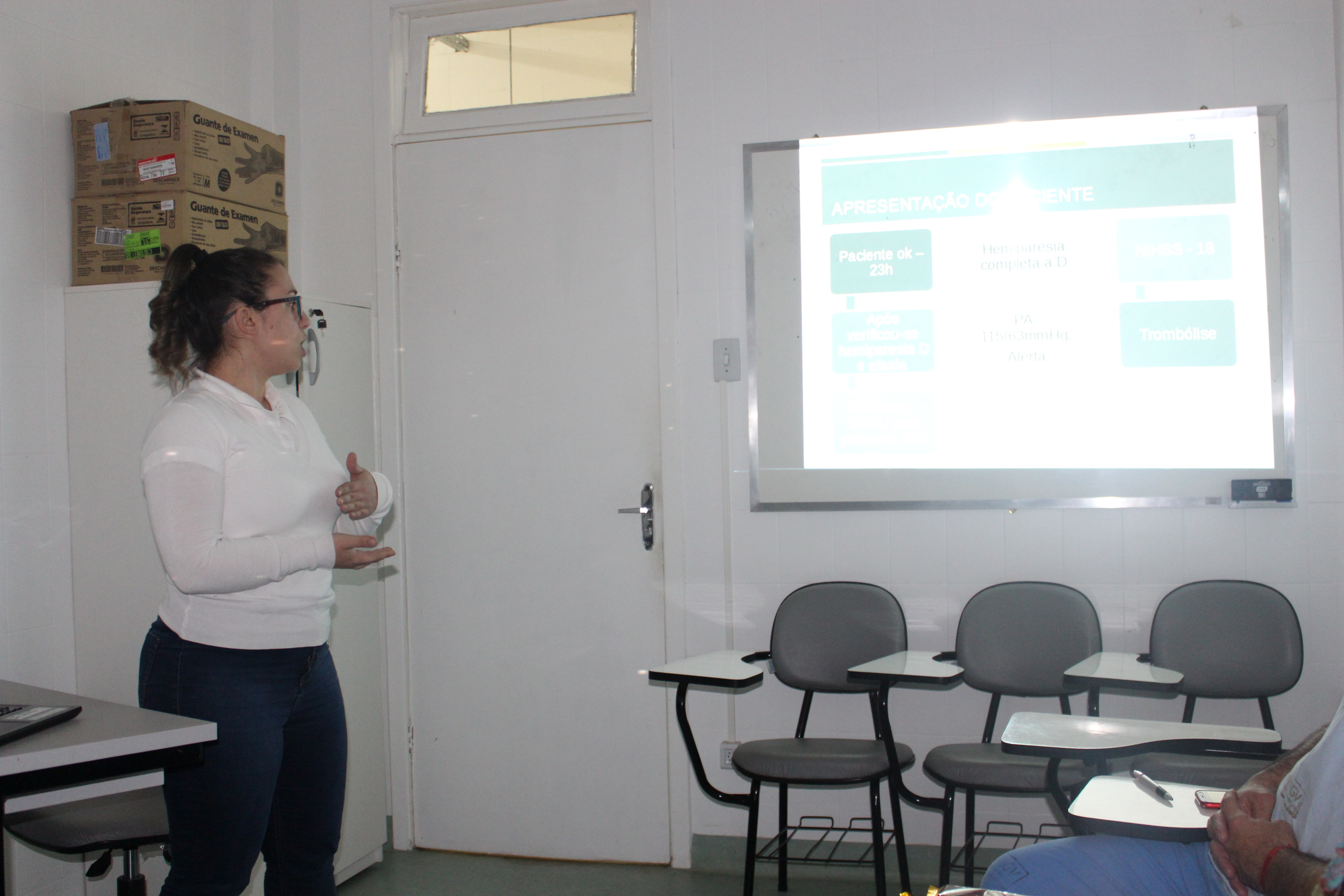 Na tarde desta quarta-feira (5), seis estagiárias de fisioterapia do HMGV apresentaram seus estudos de caso. As alunas estão distribuídas em todas as unidades de internação do Hospital e são acompanhadas pelas fisioterapeutas do quadro funcional e pela professora Alessandra Bombarda.