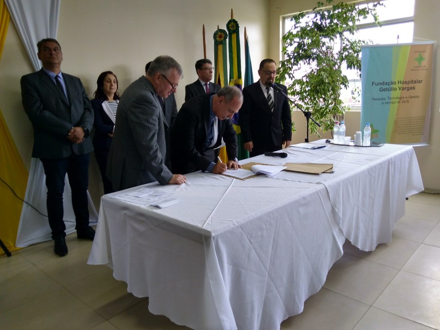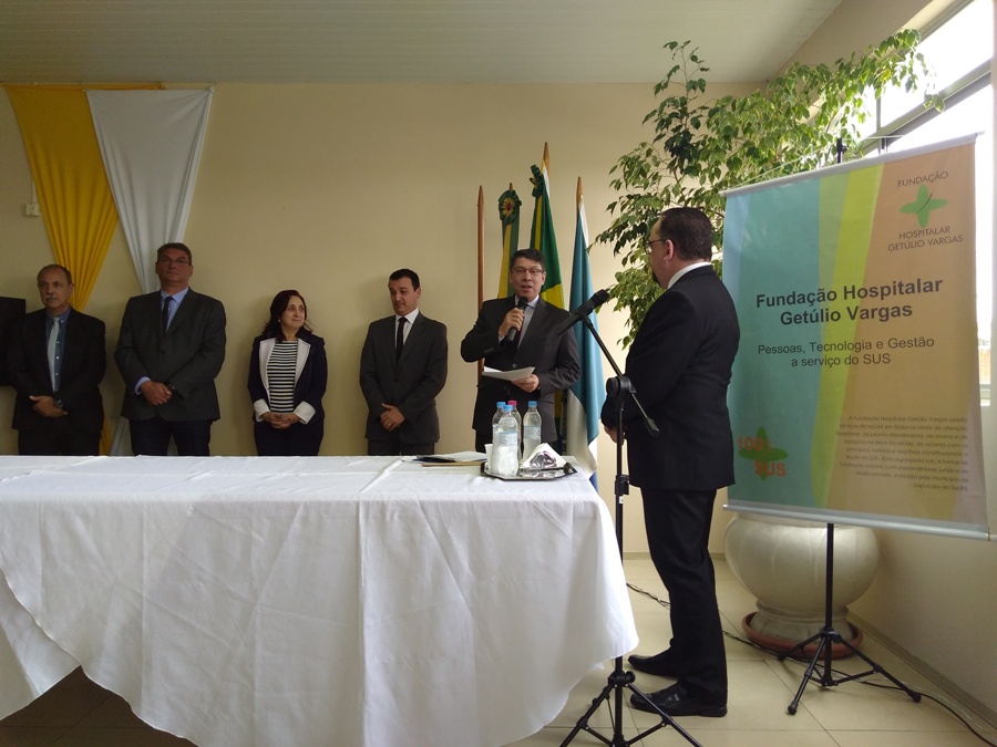O prefeito de Sapucaia do Sul, município mantenedor da FHGV, Dr. Luis Rogério Link, fez um breve histórico da participação da Fundação na gestão e recuperação de instituições de saúde no Estado, incluindo o Hospital Getúlio Vargas, em Sapucaia, e o Hospital Tramandaí. Segundo o Dr. Link, “o Hospital Tramandaí é referência para diversos municípios, e os prefeitos aqui presentes estão de parabéns por esse gesto que beneficia não apenas ao Hospital, mas às comunidades de cada um desses municípios”.