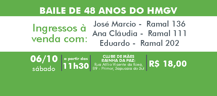 Ingressos à venda para o Galeto de Arrecadação de Fundos para o Baile de 48 anos do HMGV! O evento ocorre no dia 6 de outubro, sábado, a partir das 11h30, no Clube de Mães Rainha da Paz (Rua Atílio Vicente da Rosa, 89 – Primor).