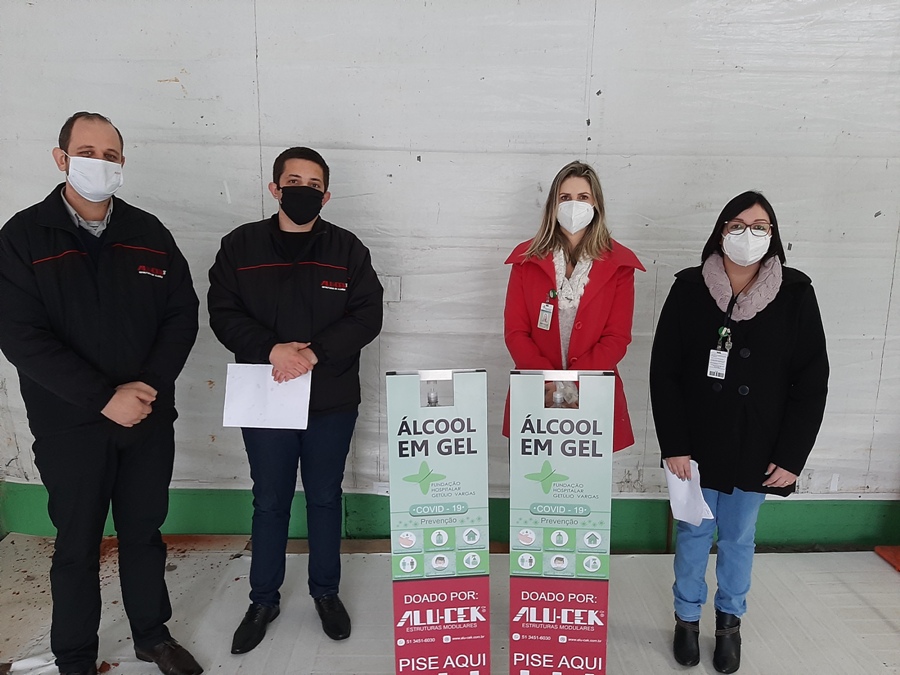 Em Sapucaia do Sul, a empresa Alu-Cek Estruturas Modulares fez a doação de dois totens em alumínio, especialmente projetados para facilitar o uso de álcool em gel. Os representantes da empresa, Matheus Wondracek e Willian Lopes da Rosa, estavam satisfeitos com a oportunidade de colaborar com o HMGV nessa situação de pandemia: “Esperamos que este pequeno gesto possa motivar outras empresas e pessoas a também ajudarem o hospital”, disseram. A gerente administrativa do HMGV, Rafaela Giacomoni, foi pessoalmente receber os totens e agradeceu a doação. As novidades serão colocados inicialmente na entrada de usuários e no corredor de acesso dos trabalhadores, junto ao caixa eletrônico. A doação desses equipamentos, que permitem que as pessoas acionem o recipiente de álcool em gel com uma leve pressão dos pés no pedal do totem, ocorreu através de intermediação da funcionária da Ouvidoria Renata Schaeffer.