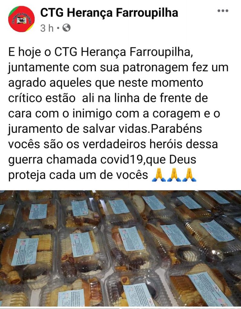 A UPA de Sapucaia do Sul recebeu na terça-feira (7) um café da manhã especial do CTG Herança Farroupilha, também do município. O Centro de Tradições Gaúchas enviou embalagens com salgados e doces aos funcionários, em homenagem ao trabalho diário de enfrentamento ao coronavírus. Segundo a patronagem do CTG, “fazemos um agrado àqueles que neste momento crítico estão ali, na linha de frente, de cara com o inimigo, com a coragem e o juramento de salvar vidas. Parabéns, vocês são os verdadeiros heróis dessa guerra chamada covid-19. Que Deus proteja cada um de vocês”. Em nome dos trabalhadores, a coordenadora da Unidade, Alessandra Linck, agradeceu o gesto e a gentileza.