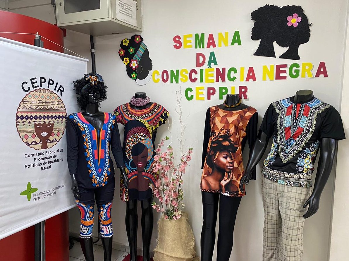 Entre a segunda-feira (16) e a sexta-feira (20) a Comissão Especial de Promoção da Igualdade Racial (Ceppir) da Fundação Hospitalar Getúlio Vargas programou uma exposição reunindo diferentes peças relacionadas à cultura negra. A mostra se divide entre dois ambientes: a entrada dos trabalhadores, junto ao relógio ponto do Hospital Municipal Getúlio Vargas, e a recepção da sede da Fundação.