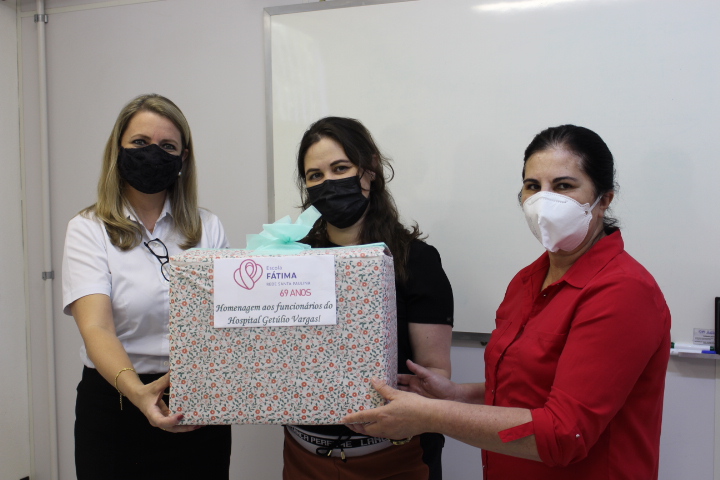 Na tarde desta sexta-feira (16/04), a gerente de Atenção à Saúde, Loredi Becker Gomes, e a gerente administrativa Raquel Froner, do Hospital Municipal Getúlio Vargas (HMGV) receberam uma caixa com cartas feitas pelos alunos de 6º e 7º ano do ensino fundamental da Escola Fátima Rede Santa Paulina de Sapucaia do Sul. A entrega foi realizada pela diretora da instituição Flávia da Costa Mentgesn.