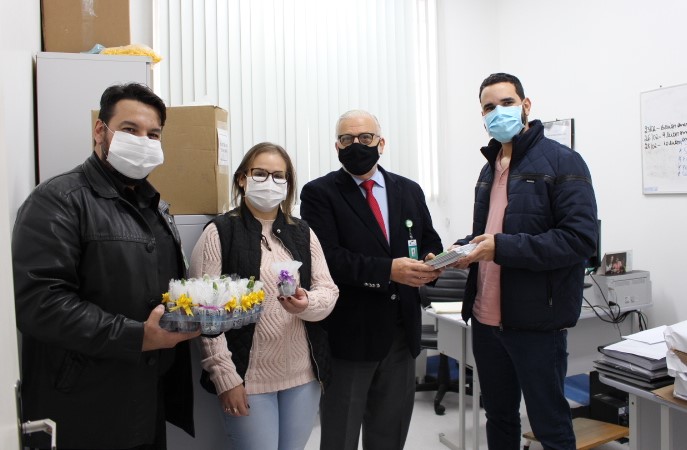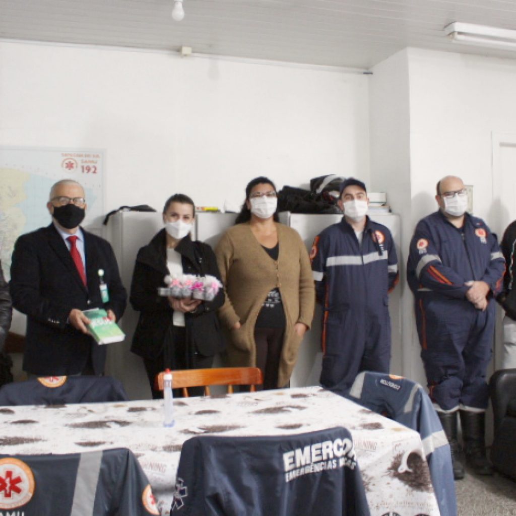 O diretor Administrativo e Financeiro (DAF) da Fundação, Marco Antonio Baldo, e o assessor técnico, Paulo Ricardo Valim, entregaram as doações na UPA para a coordenadora Bibiana Flores, e para o supervisor administrativo Victor Souza, que vão distribuir para enfermeiros e técnicos de enfermagem. No SAMU, a entrega aconteceu para a coordenadora Letícia Santomé e para os trabalhadores que estavam na unidade no momento. Letícia vai entregar os mimos aos funcionários que não estavam presentes. Maio é o mês da enfermagem porque no último dia 12 comemora-se o Dia Internacional da Enfermagem, e nesta quinta-feira (20/05), é o Dia Nacional dos Técnicos e dos Auxiliares de Enfermagem.