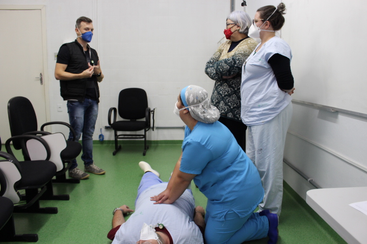 Nesta segunda-feira (07/06), aconteceu uma capacitação prática sobre parada cardiopulmonar para os profissionais das equipes de enfermagem do Hospital Municipal Getúlio Vargas (HMGV). O treinamento está sendo ministrado pelo médico Felipe Azambuja que é chefe adjunto do setor de emergência do HMGV e também acontecerá na próxima quinta-feira (10/06), às 9h, na sala 3 do hospital. Antes das instruções práticas, Azambuja preparou uma videoaula teórica que foi disparada nos grupos de WhatsApp das equipes. “O objetivo da videoaula foi nivelar o conhecimento e evitar aglomerações. Já a parte prática ocorre na modalidade presencial e serve para consolidar o conhecimento teórico, otimizando a identificação precoce da parada cardiopulmonar e o seu manejo”, explica o médico.