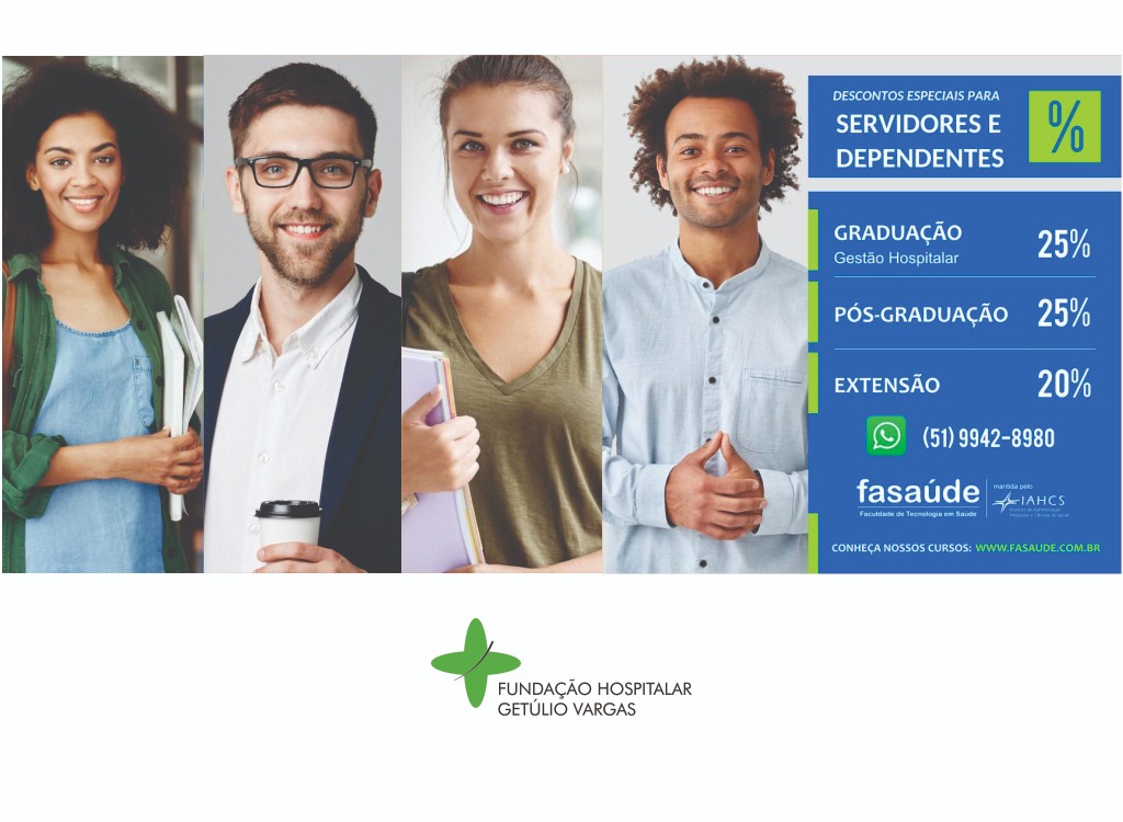 A Fundação Hospitalar Getúlio Vargas (FHGV), através do recém-criado Instituto de Ensino e Pesquisa (IEP), firmou uma parceria com a Faculdade de Tecnologia em Saúde (FASaúde), que é mantida pelo Instituto de Administração Hospitalar e Ciências da Saúde. Essa novidade possibilita que trabalhadores e dependentes tenham descontos de 25% nos cursos de graduação e de pós-graduação e 20% nos cursos de extensão.