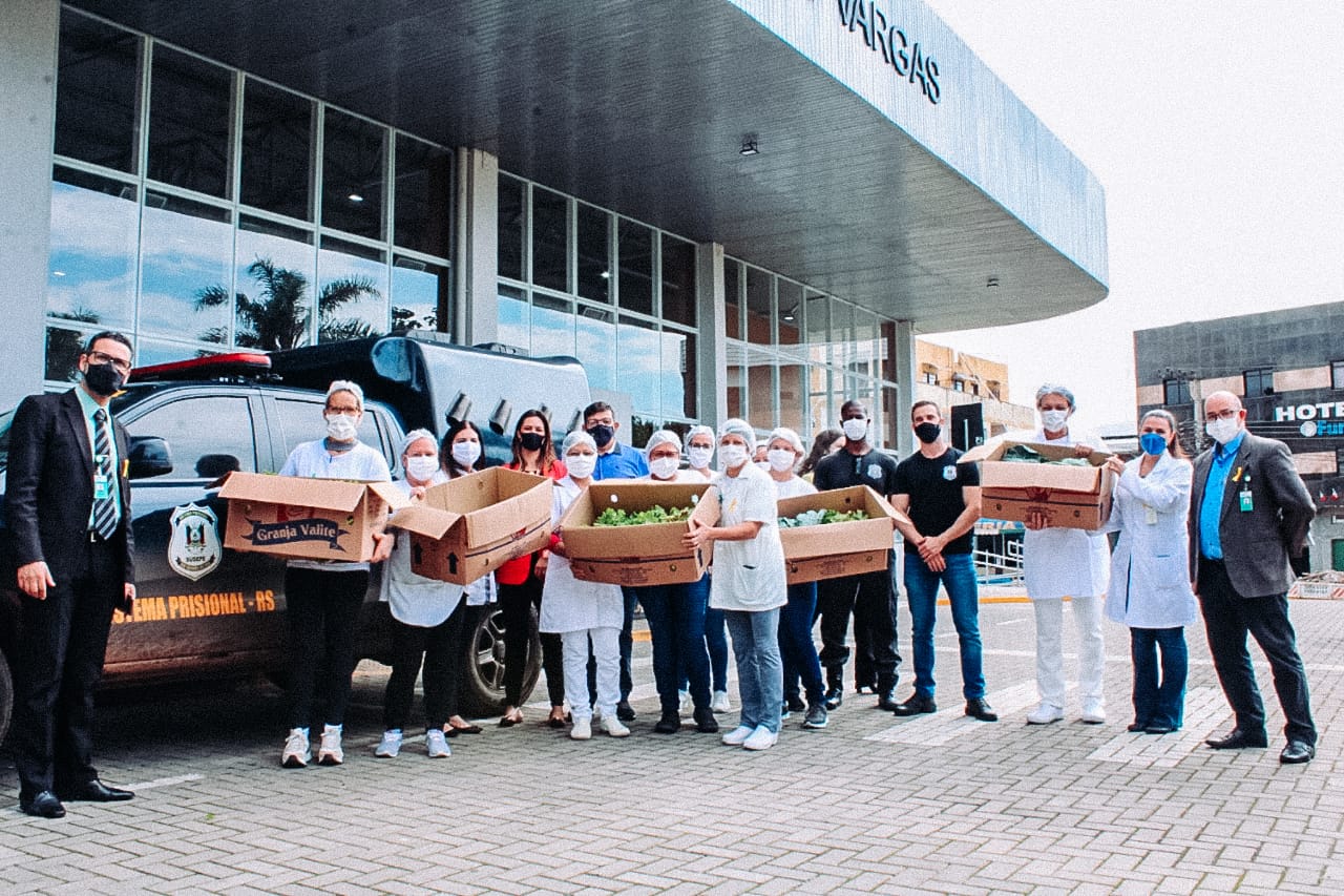 O Hospital Municipal Getúlio Vargas (HMGV) recebeu a doação de hortaliças colhidas na Penitenciária Estadual de Sapucaia do Sul. A entrega contou com a presença do diretor de Gestão e Desenvolvimento de Pessoas da Fundação Hospitalar Getúlio Vargas, Rafael Teixeira Dutra; das gerentes do hospital, Loredi Becker e Raquel Froner; da diretora da PESS Rita Leonardi,e do prefeito Volmir Rodrigues.