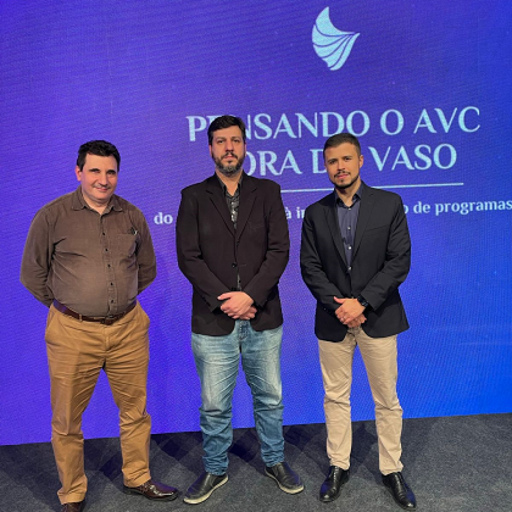 O diretor-geral da Fundação Hospitalar Getúlio Vargas (FHGV), Tércio Erany Tedesco Júnior, o diretor de Atenção à Saúde, Marcelo Bastiani Pasa, e o coordenador da Linha de Cuidado do Acidente Vascular Cerebral (AVC), Diógenes Guimarães Zãn, participaram da aula inaugural do curso de extensão do AVC da Faculdade Moinhos de Vento. Há um mês, o Hospital Municipal Getúlio Vargas (HMGV), sob a gestão da FHGV, em Sapucaia do Sul, recebeu a certificação como Centro Essencial do AVC, no Global Stroke Alliance e III Latin American Ministerial Meeting, em São Paulo.