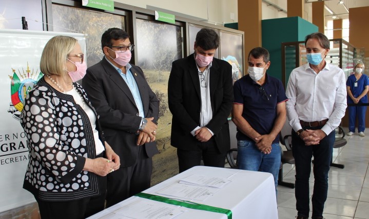 A Fundação Hospitalar Getúlio Vargas (FHGV) assinou, nessa quarta-feira (26/10), dois convênios do programa Avançar na Saúde, no valor total de R$ 13 milhões, que serão direcionados para obras de ampliação da estrutura do Hospital Municipal Getúlio Vargas (HMGV), em Sapucaia do Sul. Os diretores da Fundação, Marco Antonio Baldo, Rafael Teixeira Dutra e Tércio Erany Tedesco Júnior; a secretária da Saúde do Rio Grande do Sul, Arita Bergmann; o prefeito de Sapucaia do Sul, Volmir Rodrigues; a vice-prefeita Imilia de Souza; o presidente da Câmara de Vereadores de Sapucaia do Sul, Jorge Barbosa, entre outras autoridades estaduais e municipais, estavam presentes na solenidade que aconteceu no saguão do hospital.