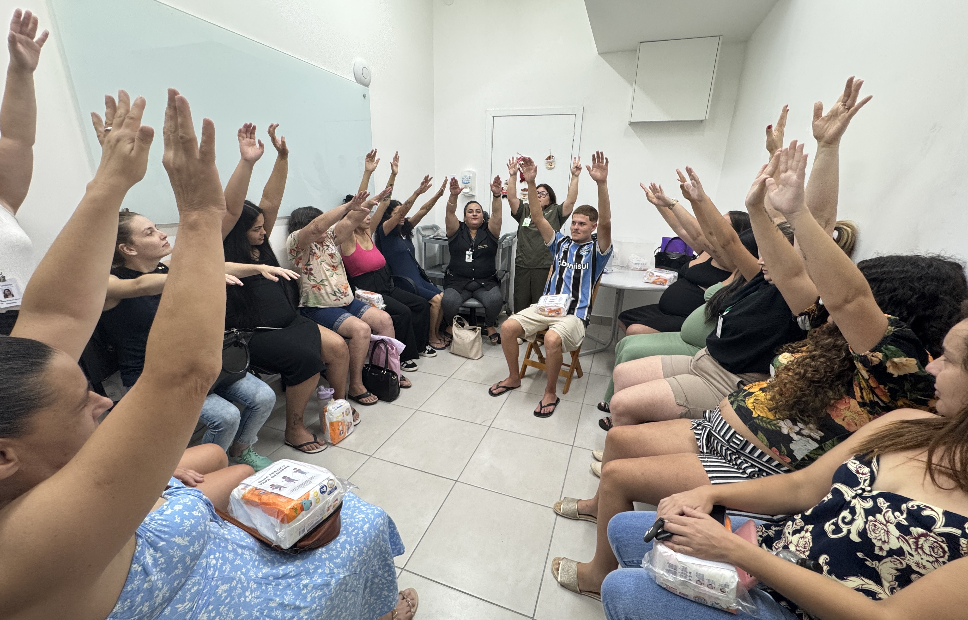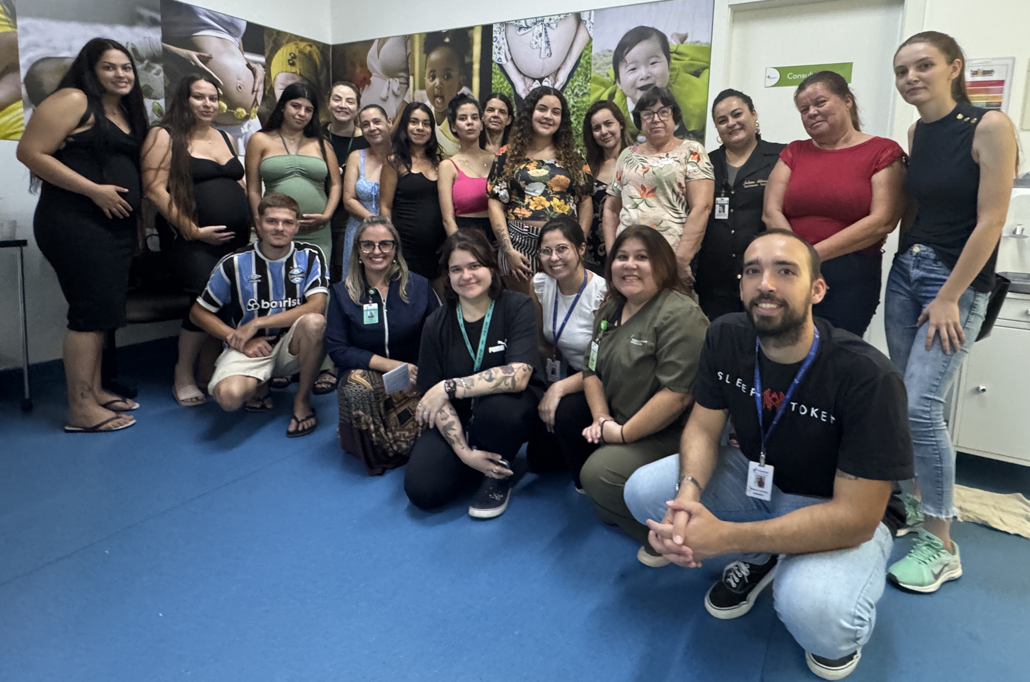 Gestantes com as equipes da ESF e do HMGV, além de residentes de Enfermagem da Unisinos